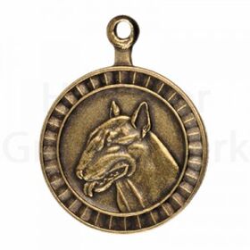 Bull terriër sennen bronzen rashondenpenning, geleverd met messing sleutelring.