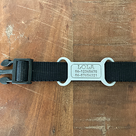 Rubberen honden ID-plaatje voor halsband of tuigje. Klein model geschikt voor riemen en tuigjes met kliksluitingen. Eenvoudig te monteren. Maximale breedte ca. 30 mm.