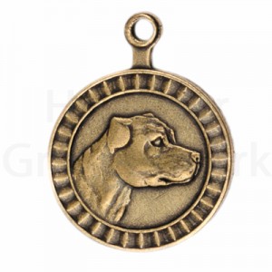 staffordshire bull terriër bronzen rashondenpenning, geleverd met messing sleutelring.